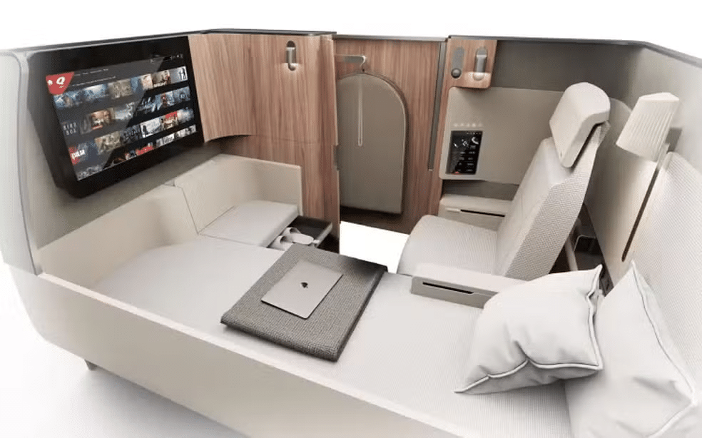 A primeira classe conta com uma suíte privativa equipada com uma cama, garantindo conforto e exclusividade aos passageiros. — Imagem: Divulgação/Qantas Airways